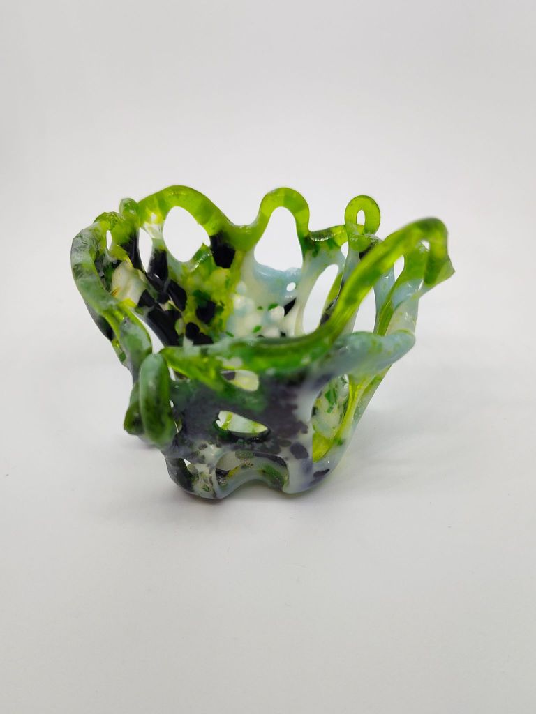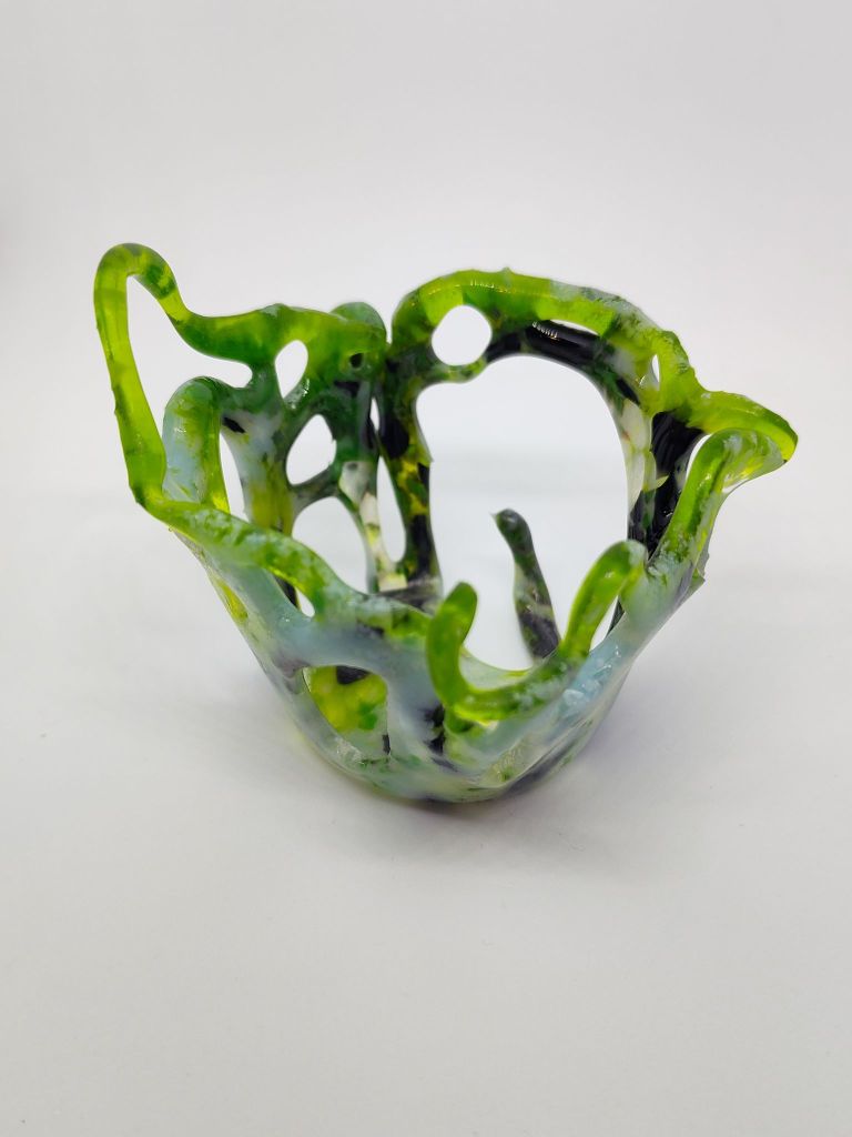 This exquisite glass piece boasts an intricate blend of green, white, and black tones, adding a pop of style and sophistication to any room.