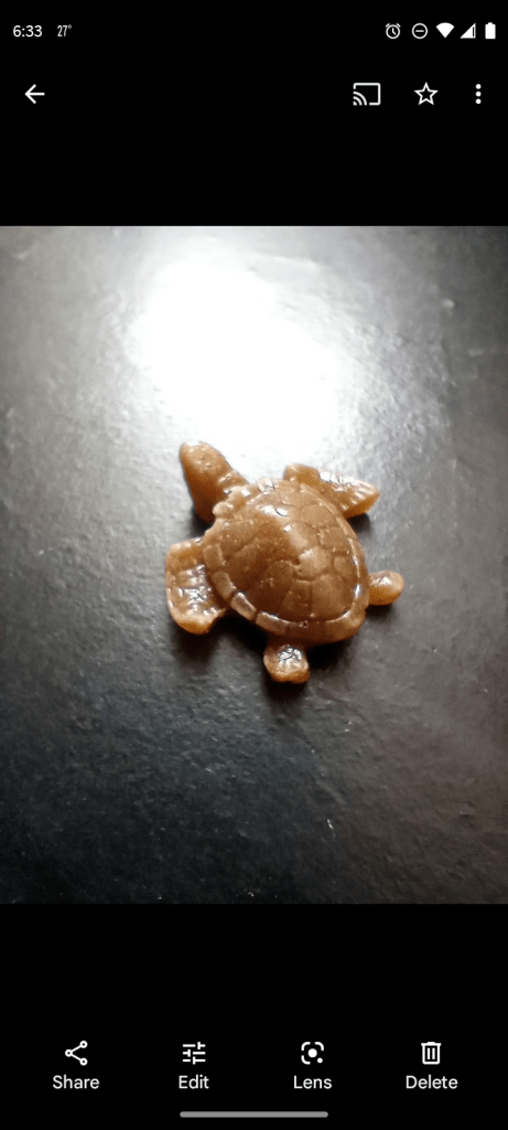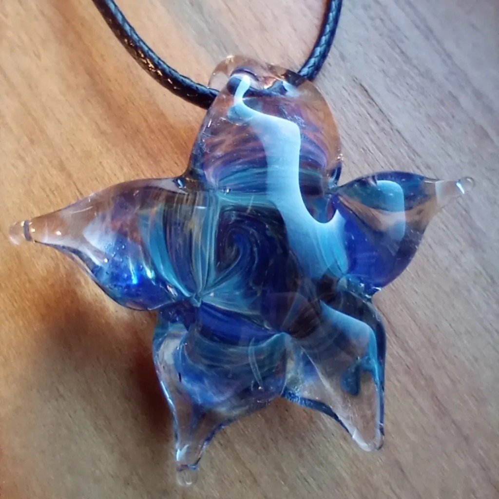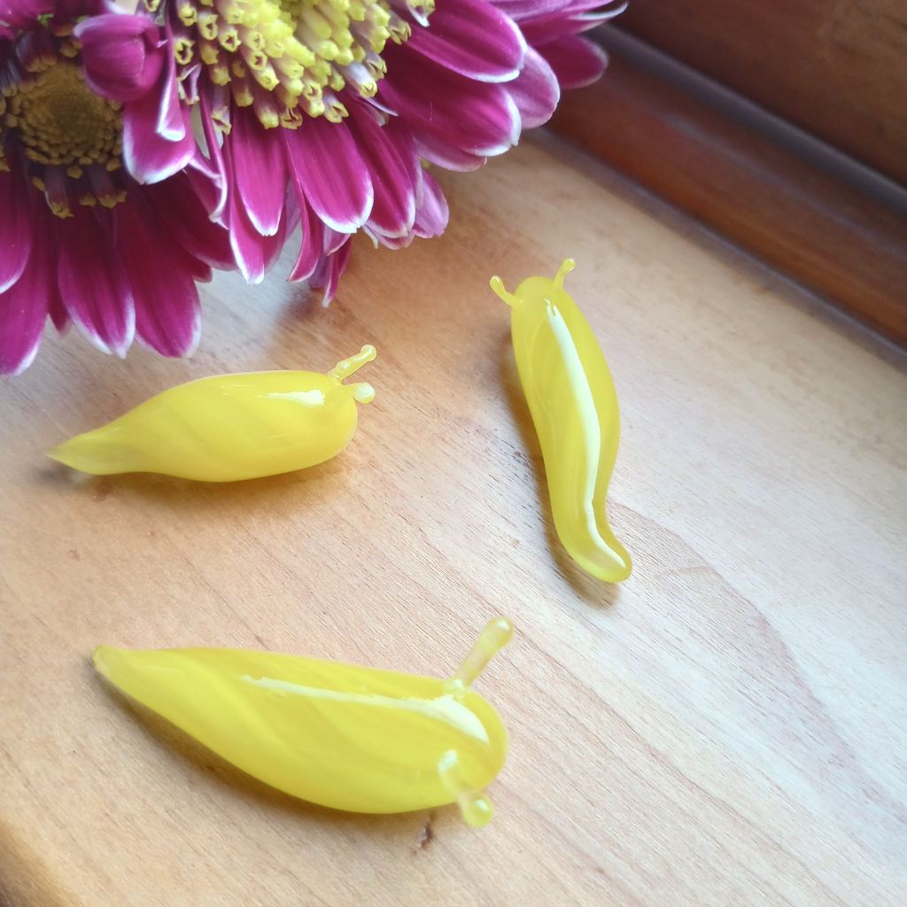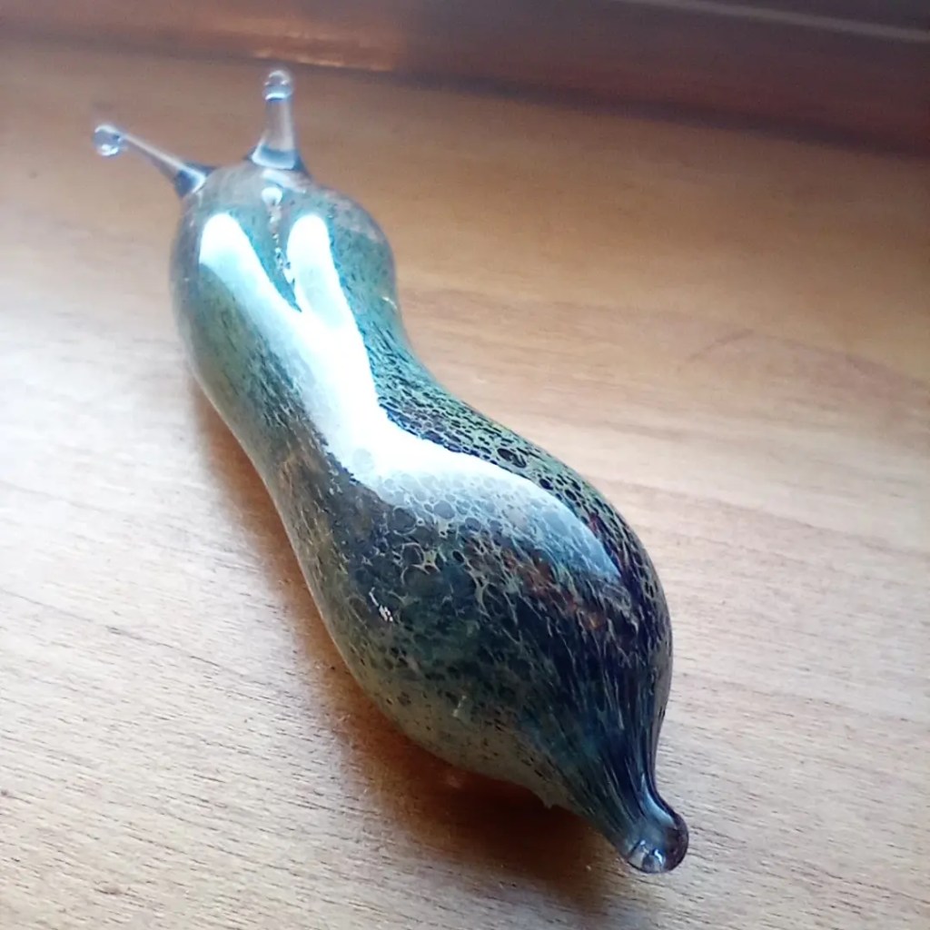 The very first slug I ever made. It’s made with one of my favorite glass colors called Alaskan Thunder.I was asking to create a large custom banana slug. So I created some baby slugs, too. What surprised me the most was the amount of people that knew what banana slugs were. A lot of great stories were shared with me about these little guys. This is a new technique I’m playing with. I love it! I need to slow down more when I create.Glass starfish are one of my favorite things to create. I need to play more with these little guys. These Buddhas or Hotei are created out of recycled glass. Broken dishes or bottles. Another thing I love is working with recycled glass. This little turtle is also created with recycled glass. I love these little guys they have so much detail.This was created for a